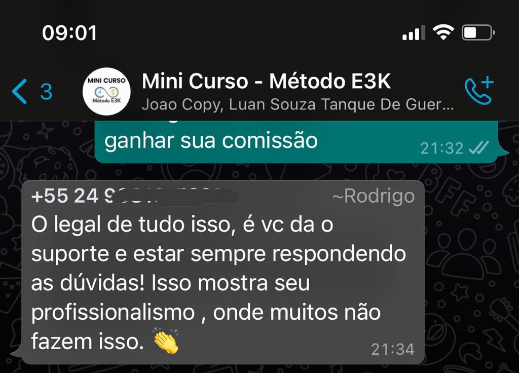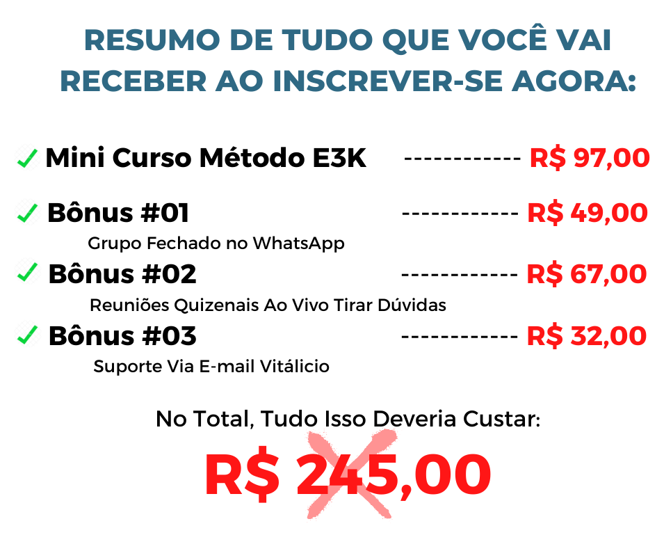 O Mini Curso Método E3K conta com uma garantia 100% de satisfação, ou seja, você tem 15 dias para acessar o conteúdo do curso e os bônus, e se ainda achar que o treinamento não é para você, basta pedir reembolso e devolverei integralmente seu dinheiro. Sem perguntas e questionamentos. Sem letras miúdas.